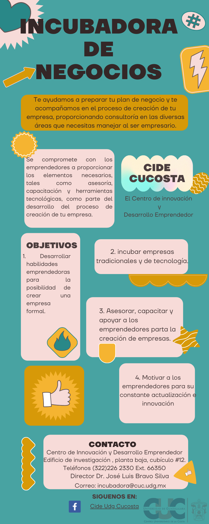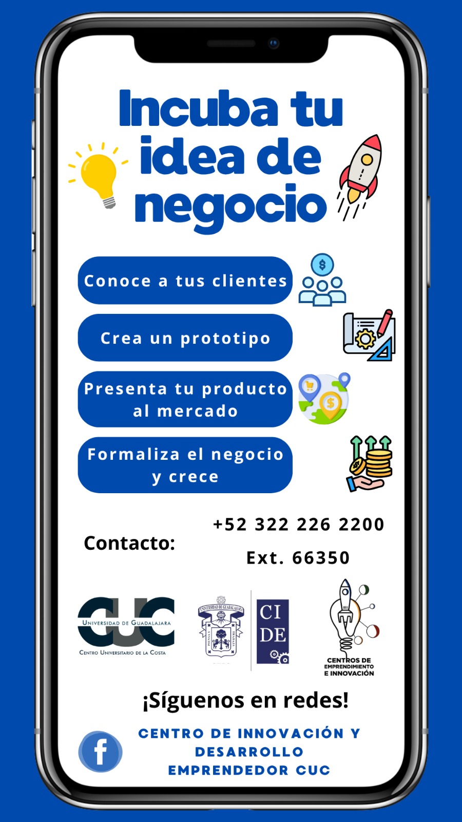 El Centro de Innovación y Desarrollo Emprendedor (CIDE) del CUCosta orienta su acción a proveer asesoría, formación y herramientas tecnológicas para la creación y fortalecimiento de empresas de base local y regional. Su compromiso es acompañar con estándares académicos, evidencia y buenas prácticas hasta la puesta en marcha y el crecimiento temprano del proyecto.